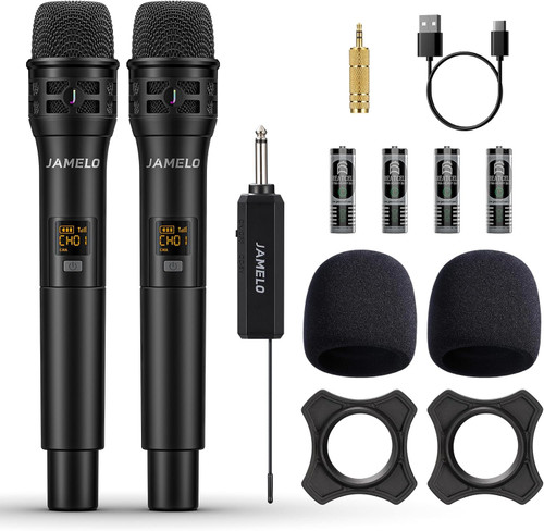 میکروفون بی سیم JAMELO، میکروفن آواز بی سیم دوگانه، میکروفون و گیرنده حرفه ای دستی، ست میکروفون کارائوکه برای دی جی، آواز، کلیسا، کلاس، عروسی، سخنرانی، جلسه- تهران فوری۵٬۶۹۴٬۹۹۴ تومان