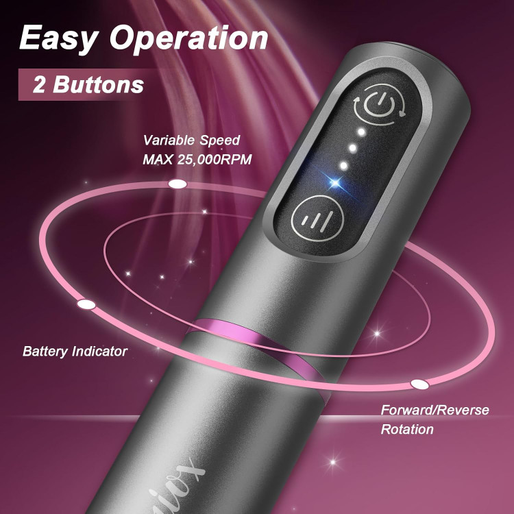۴ ساعت عمر باتری طولانی و قابلیت استفاده در حین شارژ - با باتری شارژ سریع، این سوهان ناخن میتواند در عرض ۱ ساعت به طور کامل شارژ شود و تا ۴ ساعت استفاده مداوم را فراهم کند. علاوه بر این، برای کسانی که به زمان بیشتری نیاز دارند، میتوان به راحتی در حین شارژ از آن استفاده کرد!