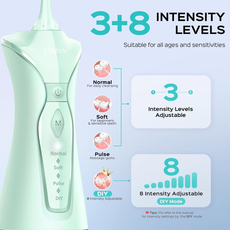 ۴ حالت را با انتخاب DIY ارتقا دهید: میتوانید حالت تمیز کردن دندانهای خود را با توجه به شرایط خود سفارشی کنید. دستگاه نخ دندان قابل حمل بیسیم دارای عملکرد حافظه است و دفعه بعد با یک دکمه قابل استفاده است.