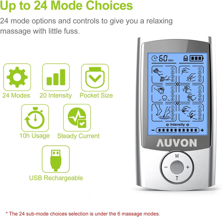 دستگاه TENS ارتقا یافته ۲۴ حالته. این دستگاه TENS دارای ۲۰ سطح شدت، ۲۴ حالت از پیش برنامهریزی شده و یک تایمر انعطافپذیر (۱۰-۶۰ دقیقه) است. باتری لیتیومی قابل شارژ داخلی میتواند تا ۱۰ ساعت استفاده را برای شما پشتیبانی کند.
