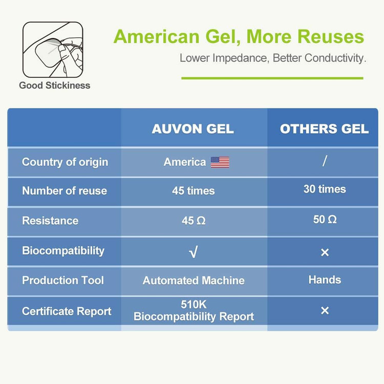 پدهای TENS با ژل ارتقا یافته. ژل جامد با امپدانس پایین به ژل آمریکایی پیشرو در صنعت با عملکرد عالی خودچسب ارتقا یافته است، به راحتی تمیز میشود و تا ۴۵ بار قابل استفاده است.