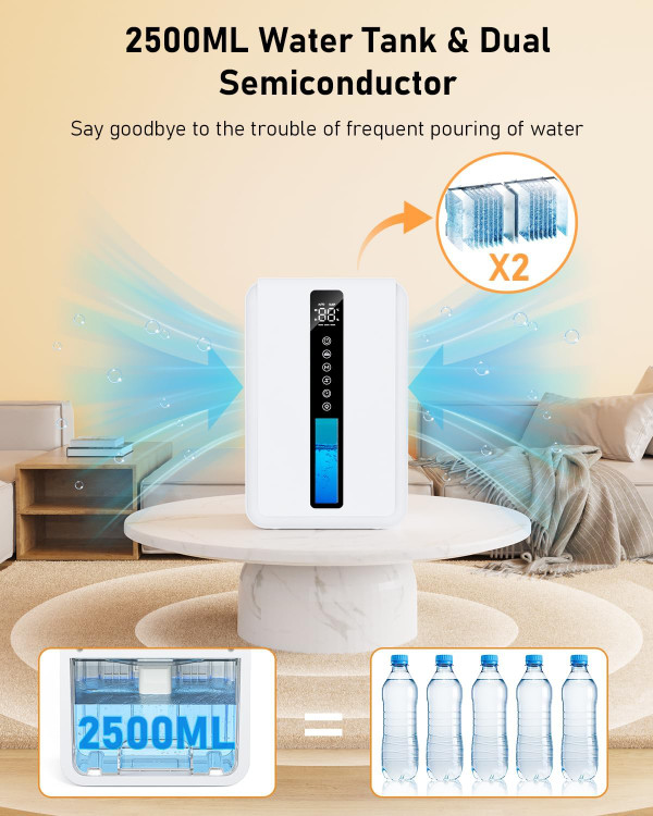 【رطوبتگیری با راندمان بالا و مخزن آب با ظرفیت بالا】رطوبتگیر اتاق خواب از فناوری پیشرفته تراکم دوگانه نیمههادی استفاده میکند. از طریق مخزن آب بزرگ 2500 میلیلیتری خود، حداکثر مساحت رطوبتگیری میتواند به 25 متر مربع برسد. رطوبت محیط را به طور موثر کاهش دهید، با روزهای مرطوب خداحافظی کنید و از یک زندگی سالم و راحت لذت ببرید.
