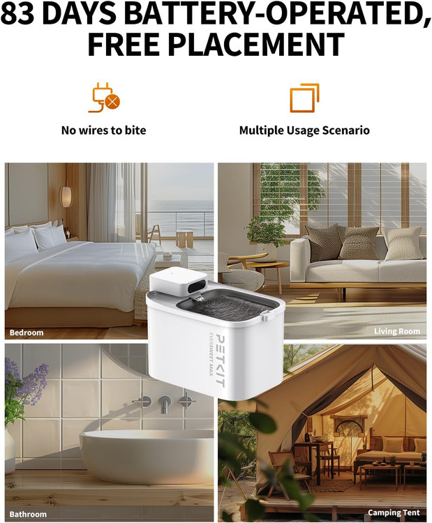 فواره آبخوری بیسیم گربه: آبسردکن بیسیم جدید و ارتقا یافته PETKIT، نیازی به اتصال به برق ندارد، میتوانید آن را در هر جایی قرار دهید: آشپزخانه، اتاق خواب، بالکن و غیره، حس جدیدی را برای شما به ارمغان میآورد؛ باتری با ظرفیت بالا ۵۰۰۰ میلیآمپر ساعت، عمر مفید تا ۸۳ روز! دیگر نگران تمام شدن آب گربه یا سگ خود در هنگام قطع برق یا سفرهای کوتاه نباشید! وقتی فواره آب کم میآورد، پمپ به طور خودکار کار را متوقف میکند تا از سوختن دستگاه جلوگیری شود.