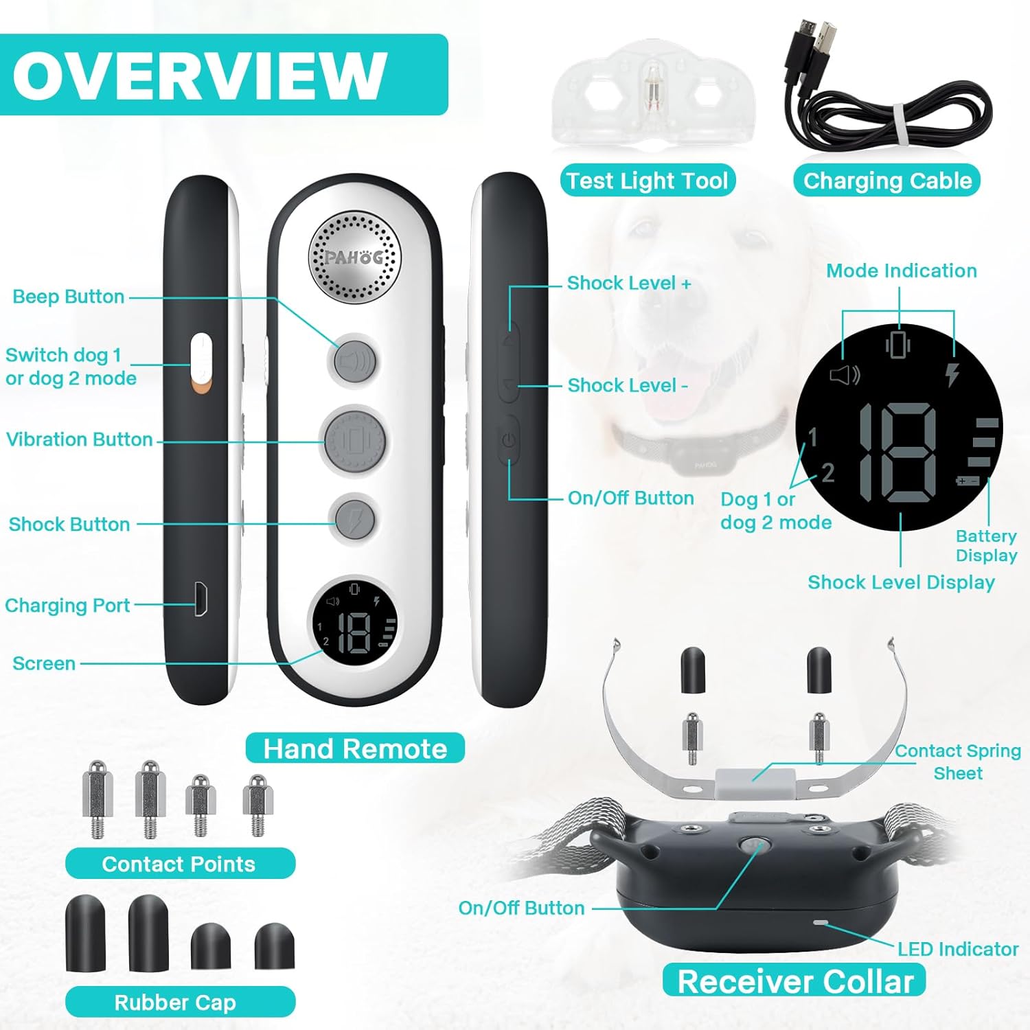 【برد کنترل از راه دور بیشتر】برد آموزش از راه دور تا ۱۰۰۰ فوت به شما امکان میدهد به راحتی سگ خود را در داخل و خارج از منزل آموزش دهید. این ریموت قلاده دارای یک صفحه نمایش LCD واضح است که کانال فعلی، میزان باتری و سطح را نشان میدهد.