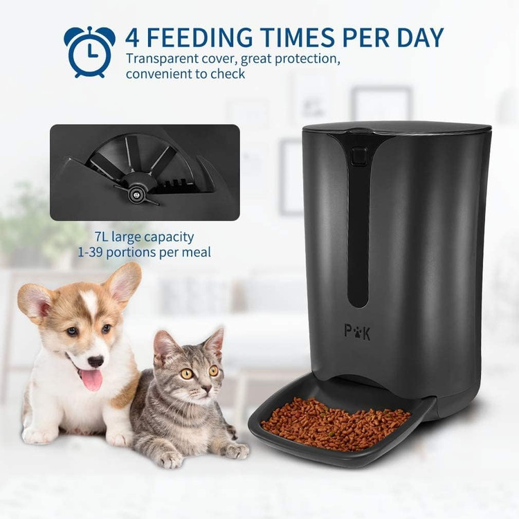 میز بزرگ نگهداری: بشکه بزرگ و شفاف ۷ لیتری نگهداری غذا فقط برای غذای خشک. این دستگاه پخشکننده غذا میتواند تا 20 فنجان (حدود 7 پوند) را در خود جای دهد، دارای صفحه نمایش LCD و قابلیت پیام هشدار کم مصرف است.