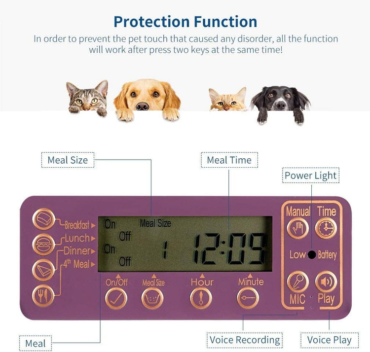 ضبط صدا ۸ ثانیهای: به مدت ۸ ثانیه فشار دهید و ۳ بار به طور خودکار پخش کنید تا با صدا زدن حیوان خانگی خود، زمان غذا، زمانبندی خودکار و تغذیه کمی را به شما اطلاع دهد.