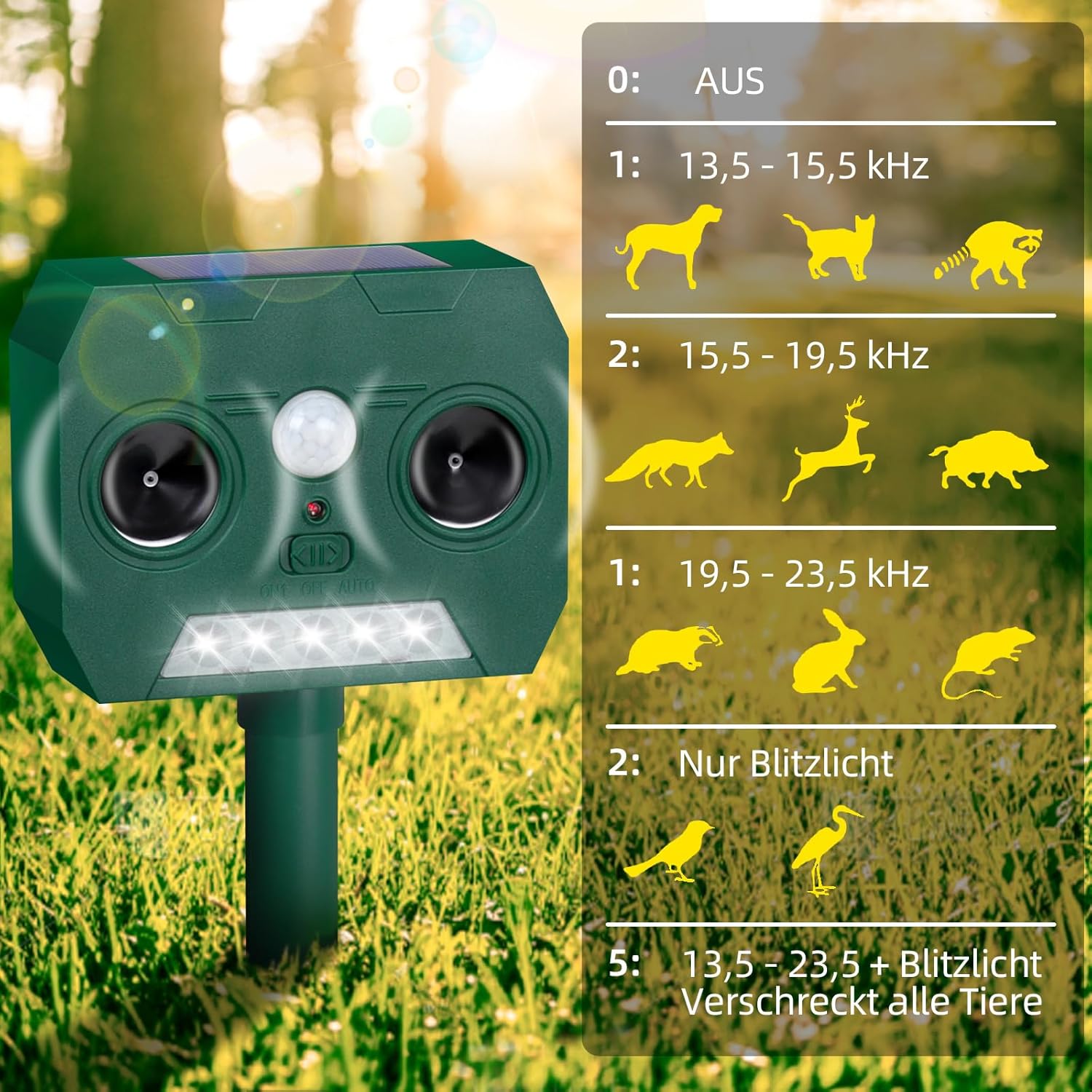 دستگاه دفع جوندگان خورشیدی ما، حرکت را در یک قوس ۱۱۰ درجه تشخیص میدهد و تا فاصله ۳۲ فوتی، امواج فراصوت با فرکانسهای ۱۳.۵ تا ۲۳ هرتز را ساطع میکند تا جوندگان، مارها، سگهای ولگرد، گربههای ولگرد، گرازهای وحشی، پرندگان، سنجاب، راکون، خرگوش، گربه، سگ، راسو، روباه و حیوانات مختلف دیگر را دور کند و آنها را از خانه، باغ یا حیاط شما دور نگه دارد.
