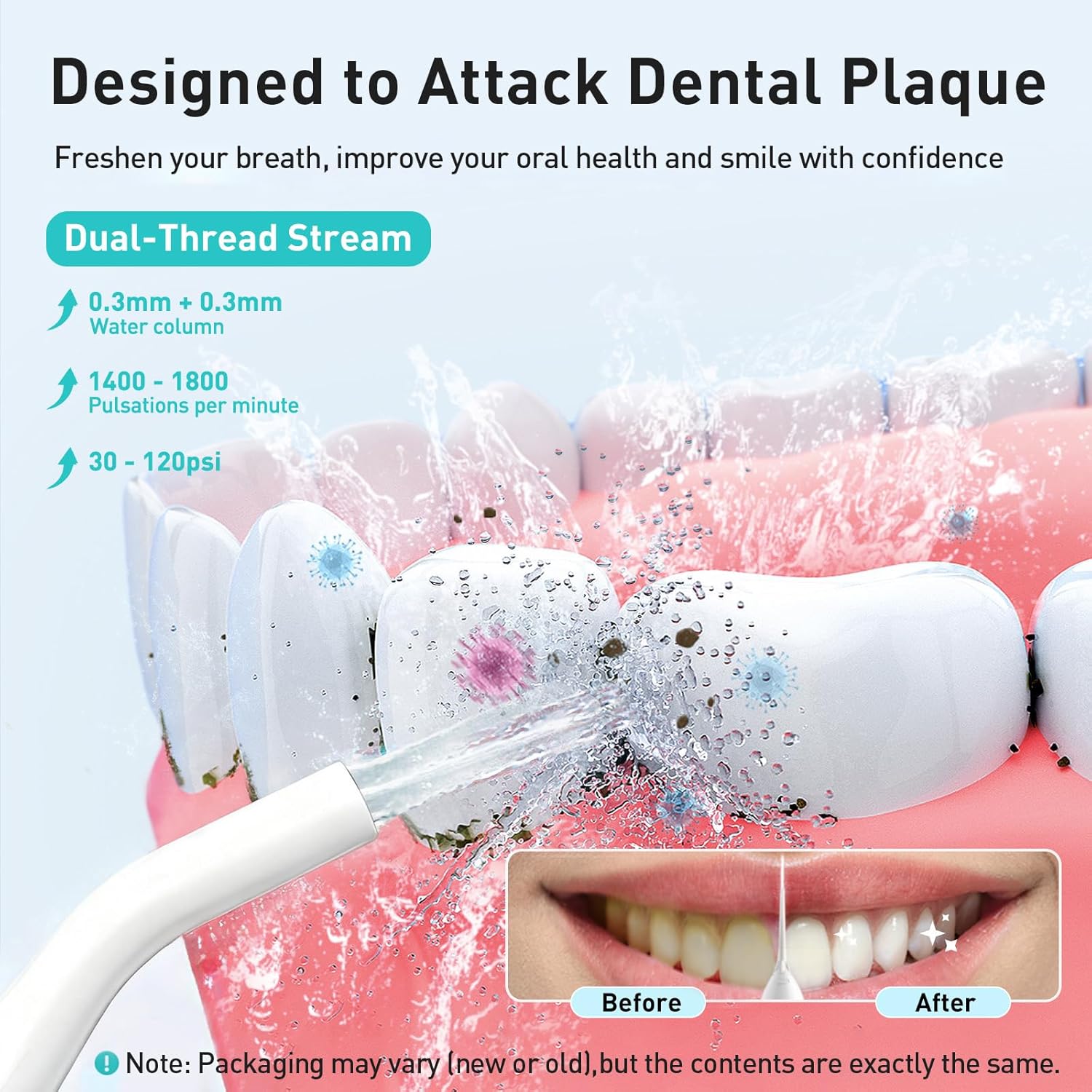تمیز کردن مؤثر برای دهانی سالمتر: واترجت COSLUS دارای فناوری پالس آب دو رشتهای فوقالعاده ظریف 0.3 میلیمتری+0.3 میلیمتری پیشرفته، ایمن و مؤثر است که توسط تیم تحقیقاتی ما طی سالها تحقیق و آزمایش کاربر واقعی توسعه یافته و به طور مداوم بهینه شده است. این دستگاه دندانپزشکی آبی، 1400-1800 پالس فشار بالا در دقیقه ارائه میدهد تا پلاک را هدف قرار داده و از بین ببرد و تمیزی کاملی را فراهم کند. این نخ دندان آبی همچنین دارای حالتهای عملیاتی متعدد و تنظیمات فشار چندگانه برای مطابقت با شرایط دهان و دندان و کاربران مختلف است.