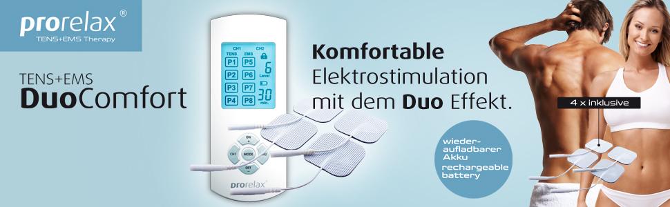 The high-quality compact device will do people with pain twice as well. With TENS function for pain relief and EMS function for muscle building. And most importantly, the prorelax TENS+EMS Duo Comfort is a certified medical device (CE 120), which gives you the confidence to use scientifically tested, effective therapy.