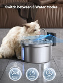 ۳ حالت کار و ۲ جریان آب: فواره آب گربه بیسیم ما ۲ جریان آب (شیر آب و فواره) و ۳ حالت عملکرد را برای رفع نیازهای حیوان خانگی شما ارائه میدهد: حالت حسگر (محدوده ۱۲۰ درجه در ۵ فوت): جریان آب در صورت نزدیکی گربه ۲۰ ثانیه طول میکشد. حالت زمانبندی شده: آب هر ۱۵ دقیقه ۱۵ ثانیه جاری میشود. حالت مداوم: آب به طور مداوم جریان مییابد (فقط در صورت اتصال به برق). حالت حسگر برای صرفهجویی در مصرف انرژی توصیه میشود.