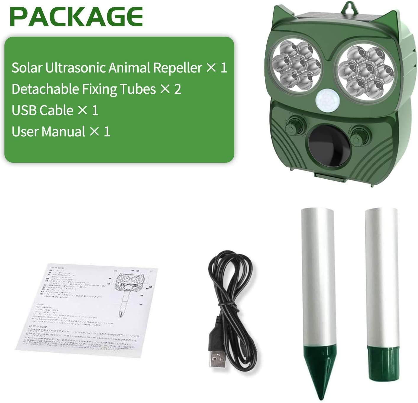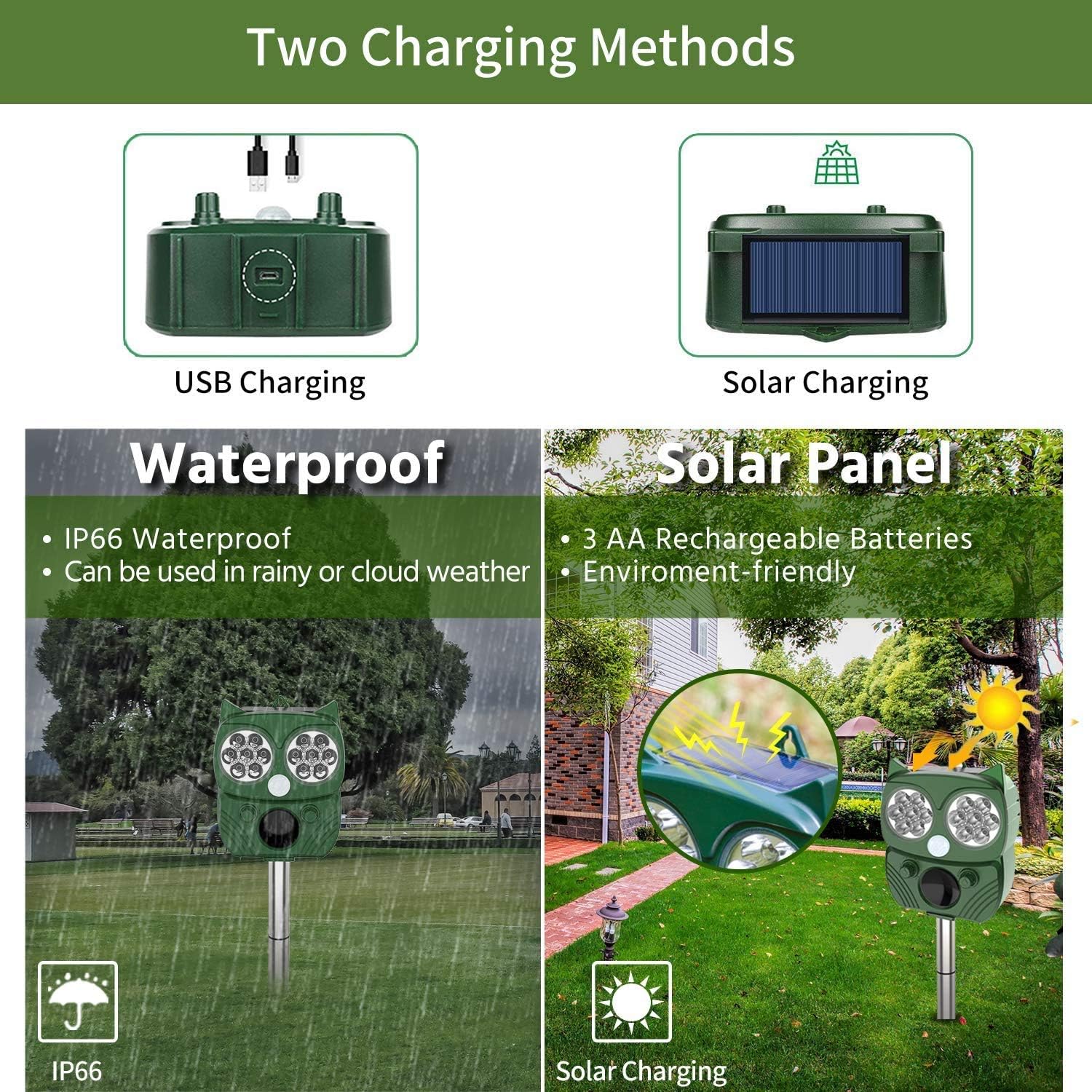 دور کننده حیوانات -- دفع کننده حیوانات اولتراسونیک، دارای سنسور PIR ضد آب و انرژی خورشیدی برای فضای باز، دارای قابلیت فعال شدن با حرکت و نور و صدای چشمک زن LED، به طور موثری گربه، سگ، روباه و پرندگان را فراری میدهد.