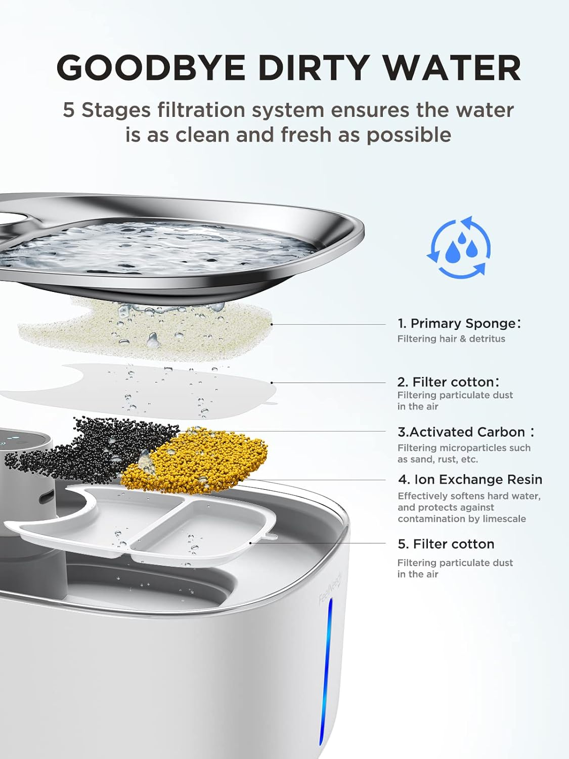 سیستم فیلتراسیون چرخشی ۴ لایه: از رزین تبادل یونی، کربن فعال، پارچه نبافته و اسفنج با چگالی بالا برای حذف موثر یونهای فلزات سنگین، بوها و ناخالصیها استفاده میکند و تضمین میکند که هر جرعه تازه و تمیز است.