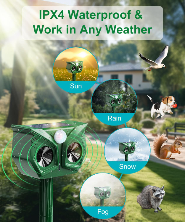 【ساختار ضد آب و محکم】 این دستگاه دفع گربه برای باغ که از پلاستیک ABS مقاوم ساخته شده است، در برابر آب و هوا مقاوم بوده و دارای رتبه IPX4 ضد آب است. این دستگاه میتواند در برابر پاشش آب، باران و قرار گرفتن در معرض فضای باز مقاومت کند و آن را برای استفاده طولانی مدت در باغها، حیاطها، مزارع و باغها مناسب میکند. 【سنسور حرکت PIR با اولتراسونیک و چراغ چشمک زن】 سنسور حرکت مادون قرمز PIR یکپارچه، هر زمان که حرکتی تشخیص داده شود، دستگاه را فعال میکند و موجی از امواج صوتی اولتراسونیک را در کنار چراغهای LED چشمک زن آزاد میکند. این عامل بازدارنده دوگانه به دور نگه داشتن بازدیدکنندگان ناخواسته مانند گربه، سگ، موش، راسو و موارد دیگر کمک میکند.