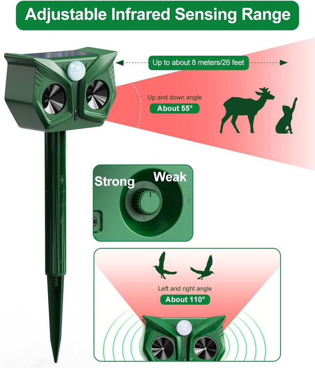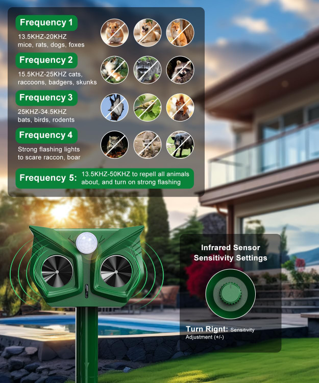 【حالتهای حساسیت قابل تنظیم】 این دستگاه دفع گربه اولتراسونیک با ۵ سطح حساسیت قابل انتخاب طراحی شده است که به شما امکان کنترل انعطافپذیر بر روی محدوده تشخیص را میدهد. چه بخواهید حیوانات کوچکتر مانند گربه، سگ و پرندگان را فراری دهید و چه حیوانات بزرگتر مانند گراز وحشی، سنجاب، راکون یا گوزن، میتوانید تنظیمات را برای رسیدن به بهترین نتیجه تنظیم کنید.