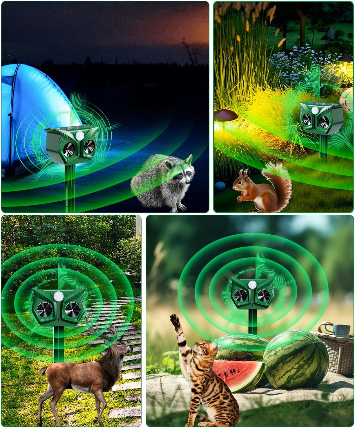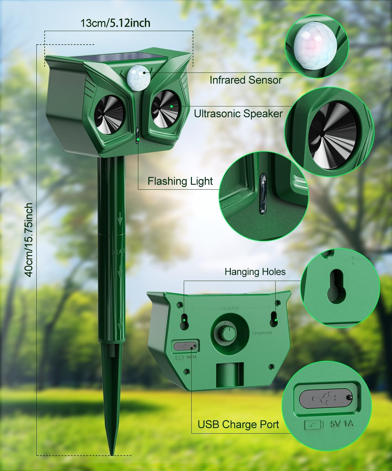 دافع حیوانات، دورکننده حیوانات - اولتراسونیک با قابلیت تشخیص حرکت و تغذیه از طریق USB و انرژی خورشیدی، ضد آب، مناسب برای دفع روباه، سنجاب و جوندگان ن1