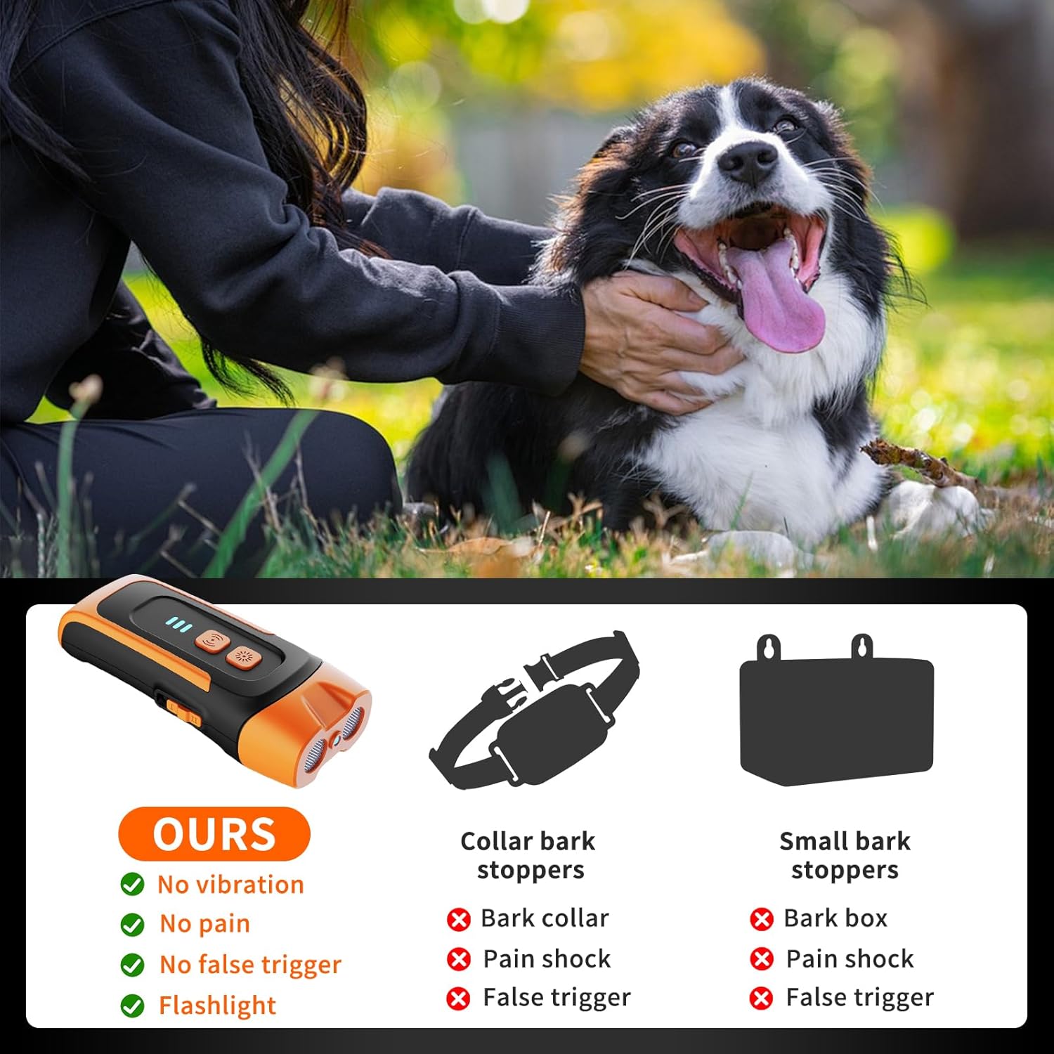 🐶-- این دستگاه کنترل پارس سگ نسبت به اکثر محصولات دیگر برد کنترل بیشتری دارد و بدون شوک الکتریکی و بوی تحریک کننده است، برای سگها بسیار ایمن است و هیچ آسیبی به سگها وارد نمیکند.