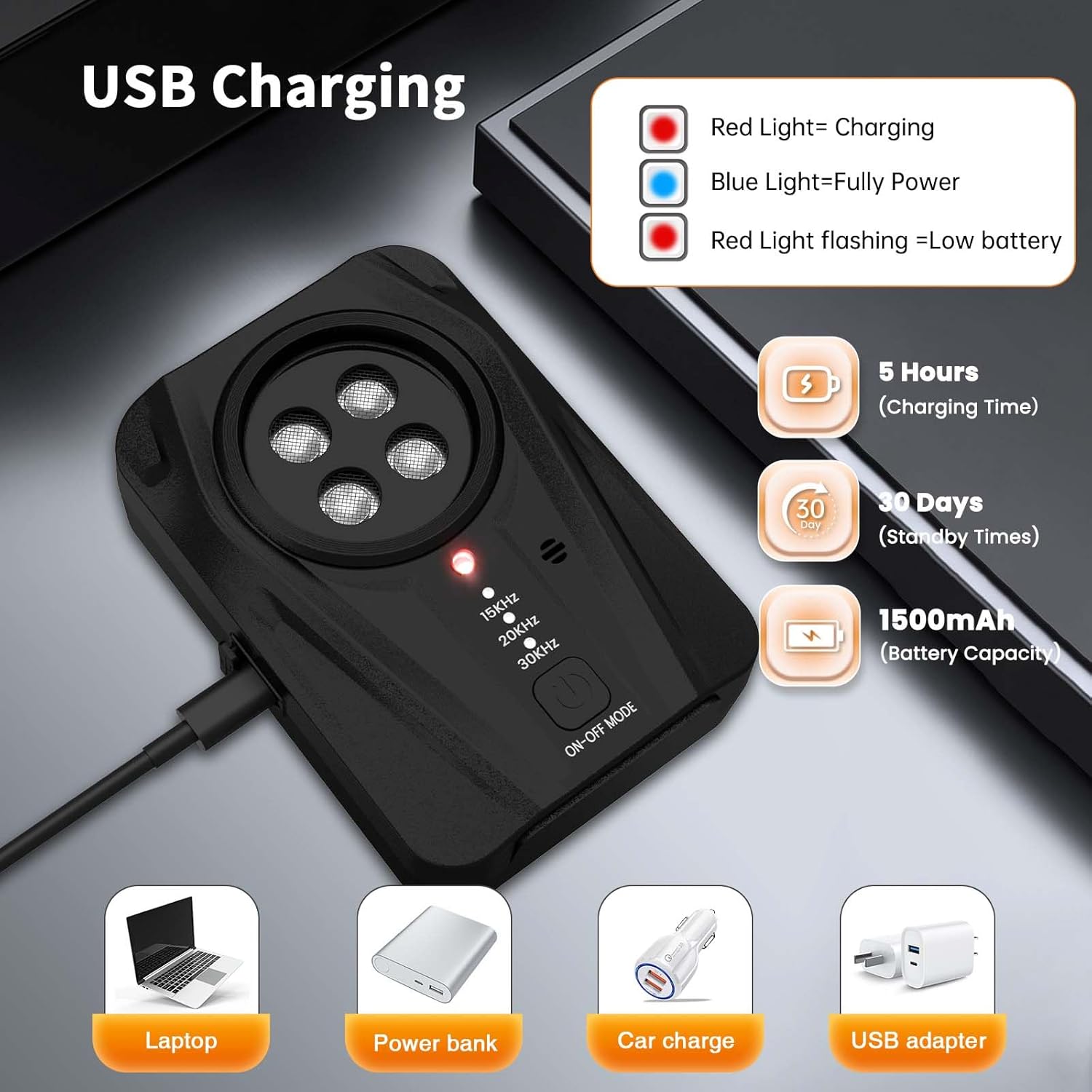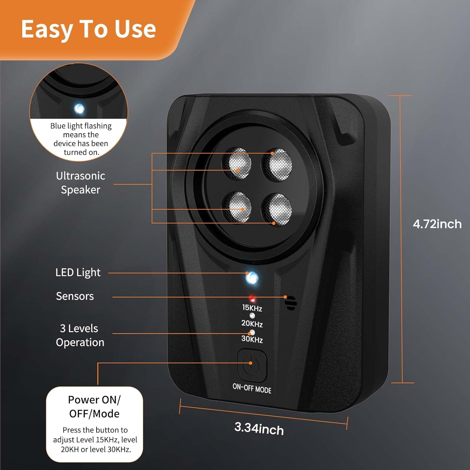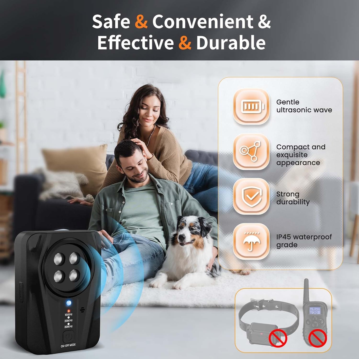 ۳ حالت عملکرد: در مقایسه با سگهای اولتراسونیک معمولی، دستگاه ضد پارس سگ ما نه تنها ۲ حالت اولتراسونیک (۲۰-۲۵ کیلوهرتز) دارد، بلکه یک حالت صوتی نیز برای سگهای حساس ایجاد کرده است. ۲. حالت اولتراسونیک یک حالت بیصدا است که برای گوش انسان قابل شنیدن نیست و مشکلی برای شما ایجاد نمیکند.