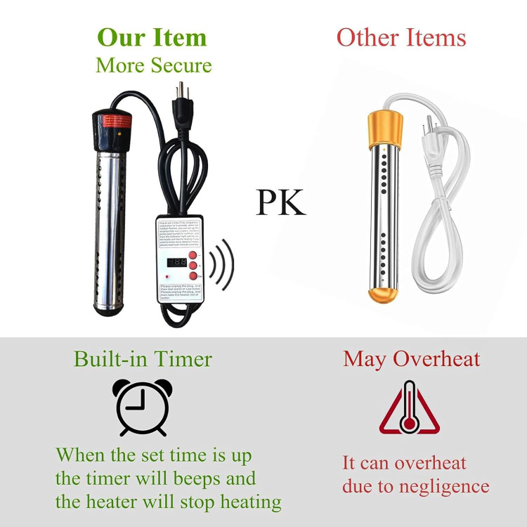 - Experience durability and safety with our immersion heater, featuring a fireproof fiber shell and 304 stainless steel guard.