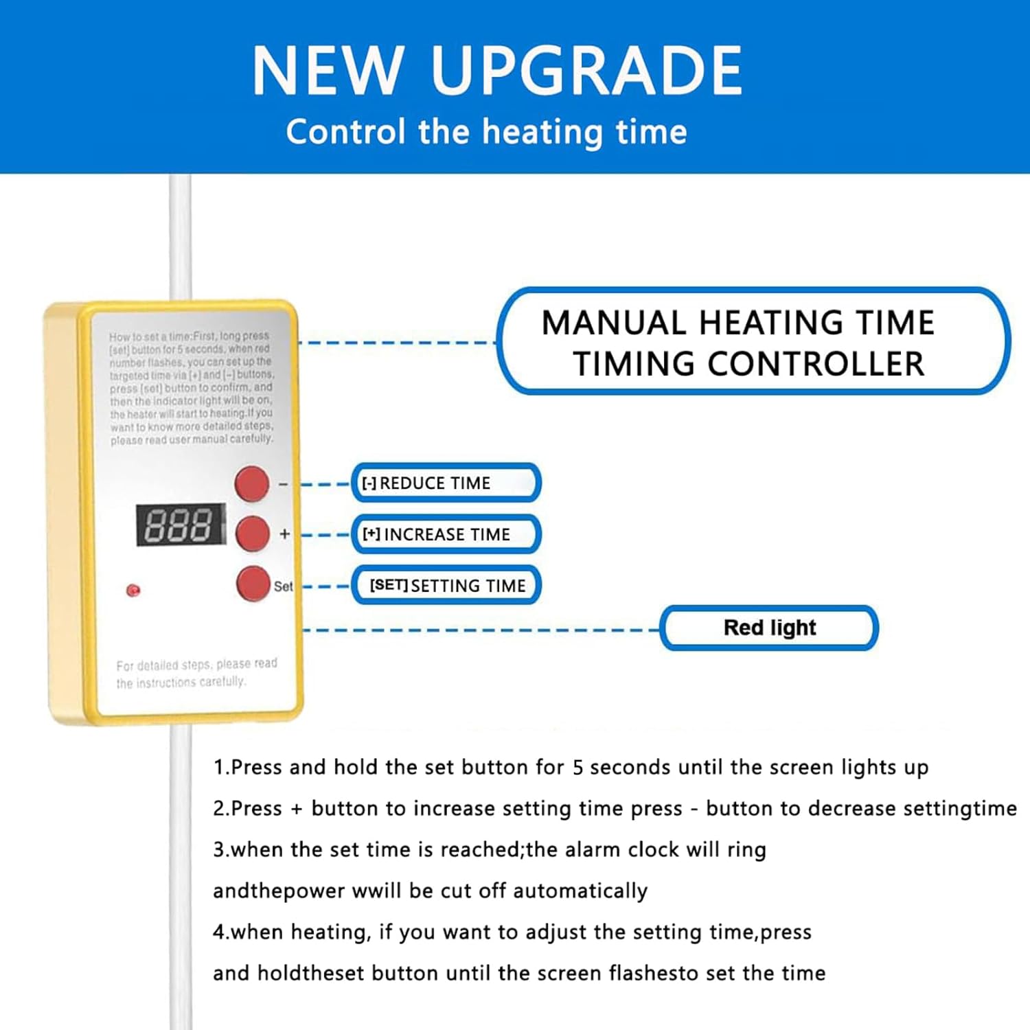 The bathtub heater will automatically shut off at the set time, effectively avoiding fire. Notice: Do not touch water during connected the power to prevent electric shock! Please unplug the power or touch the outside of the container to test the water temperature.