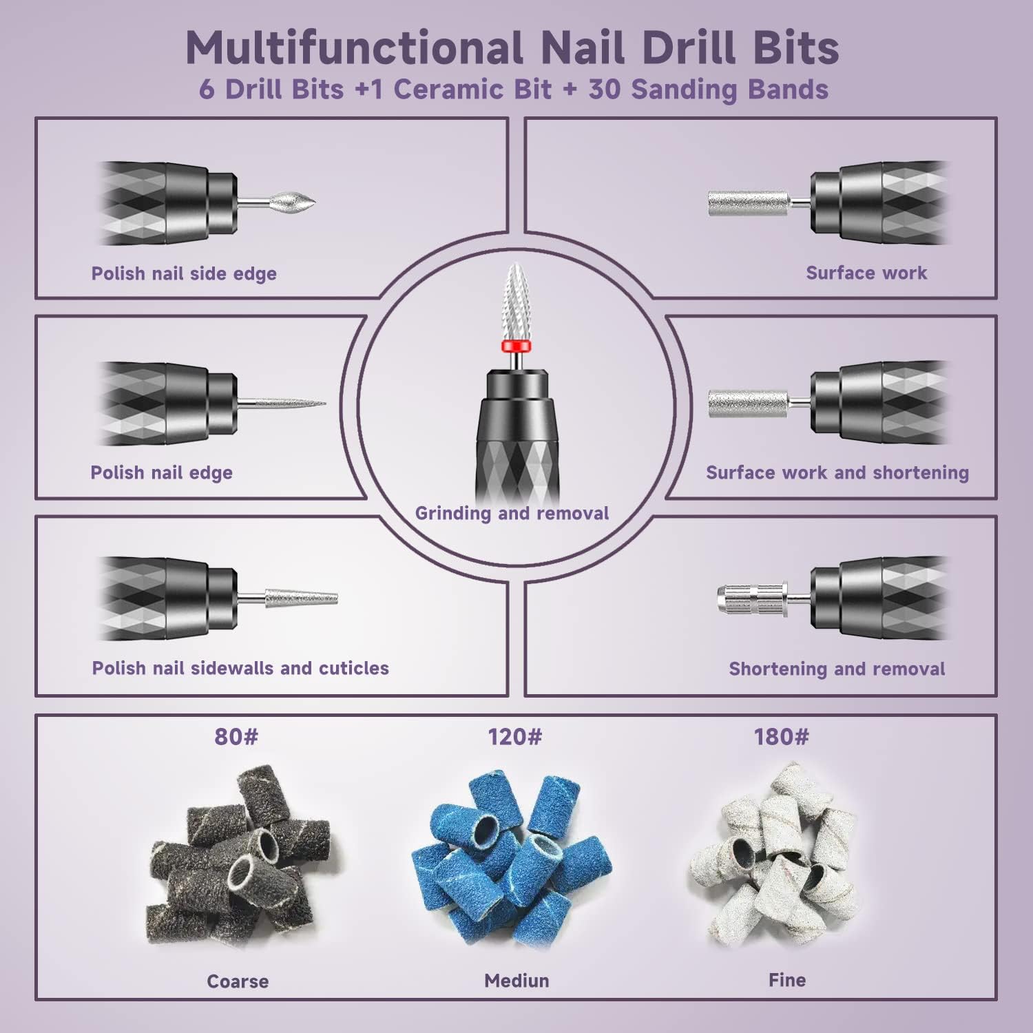 It comes with 7pcs different type of nail drill bits and a large pack of extra sanding bands, making you easier to use, you can play around with different nail styles and host your personal nail salon in comfort of your own home.