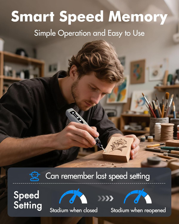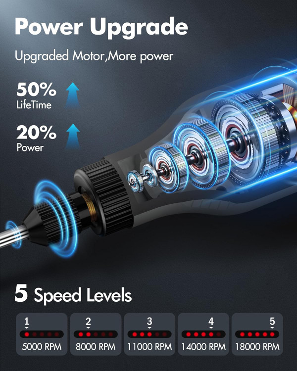 تنظیم قدرتمند ۵ سرعته: این ابزار چرخشی بیسیم مجهز به ۵ سطح سرعت قابل تنظیم (۵۰۰۰/۸۰۰۰/۱۱۰۰۰/۱۴۰۰۰/۱۸۰۰۰ دور در دقیقه) است و با تمام سناریوهای کاری سازگار میشود. برای پولیش/تمیز کردن از ۵۰۰۰-۸۰۰۰ دور در دقیقه، برای حکاکی/حکاکی از ۱۱۰۰۰-۱۴۰۰۰ دور در دقیقه و برای برش کارآمد از ۱۸۰۰۰ دور در دقیقه استفاده کنید - یک ابزار همه این کارها را انجام میدهد.