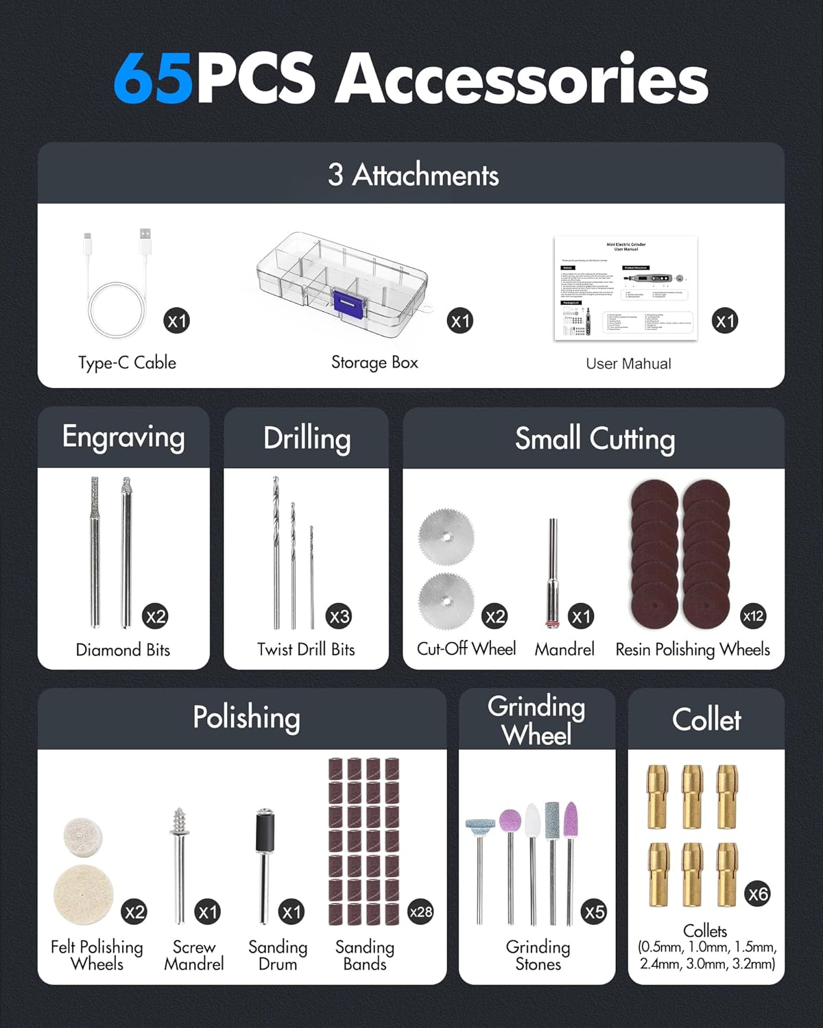 کیت کامل ۶۴ عددی لوازم جانبی: مجموعه ابزار چرخشی بیسیم شامل انواع مختلفی از ابزارهای چرخشی مانند نوارهای سنباده، متههای الماس، چرخهای پولیش، سنگهای سمباده، کولتها (با قطرهای مختلف ۰.۵ میلیمتر، ۱.۰ میلیمتر، ۱.۵ میلیمتر، ۲.۴ میلیمتر، ۳.۰ میلیمتر، ۳.۲ میلیمتر) و غیره است که به دستگاه اجازه میدهد مستقیماً عملیات سوراخکاری، پولیش، حکاکی، تمیزکاری، سنگزنی، برش، مانیکور و غیره را انجام دهد.