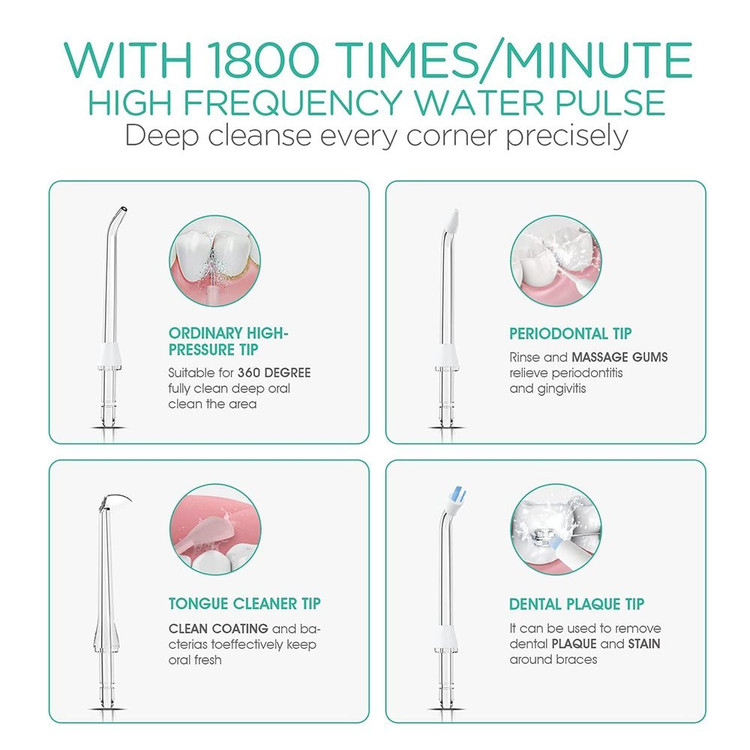 ✅تمیز کردن دندان ها و لثه ها: فلوسر آب شارژی 1800 بار در دقیقه از پالس های آب با فرکانس بالا با یک جت آب بسیار ریز تثبیت شده 0.6 میلی متری استفاده می شود تا به طور طبیعی 99.99٪ از باقی مانده های مواد غذایی باقی مانده باشد. و جرم را از بین ببرد و در عین حال لثه های شما را حرکت می کند و نفس شما را تازه نگاه می کند. و بهبود سلامت لثه