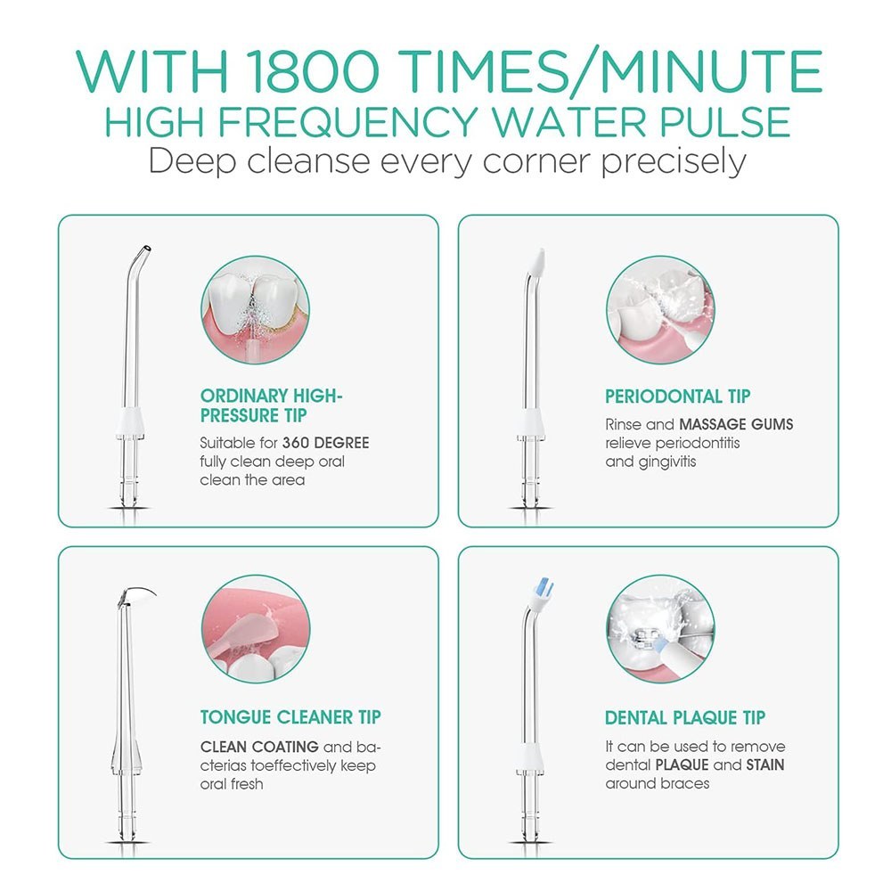 ✅تمیز کردن دندان ها و لثه ها: فلوسر آب شارژی 1800 بار در دقیقه از پالس های آب با فرکانس بالا با یک جت آب بسیار ریز تثبیت شده 0.6 میلی متری استفاده می شود تا به طور طبیعی 99.99٪ از باقی مانده های مواد غذایی باقی مانده باشد. و جرم را از بین ببرد و در عین حال لثه های شما را حرکت می کند و نفس شما را تازه نگاه می کند. و بهبود سلامت لثه