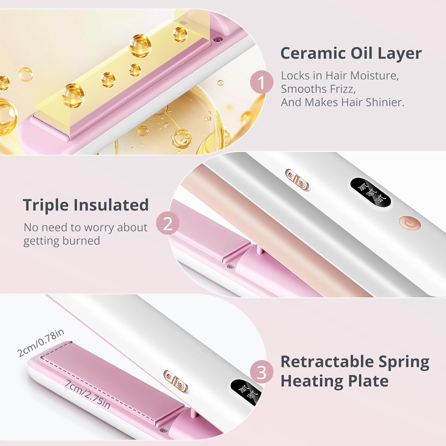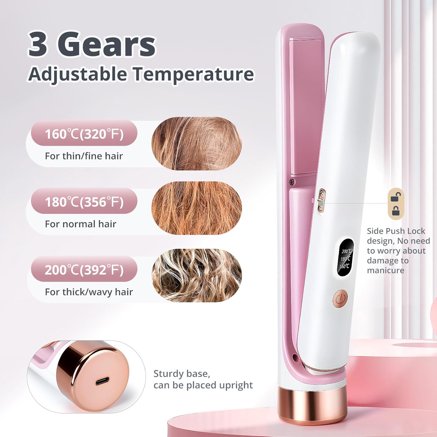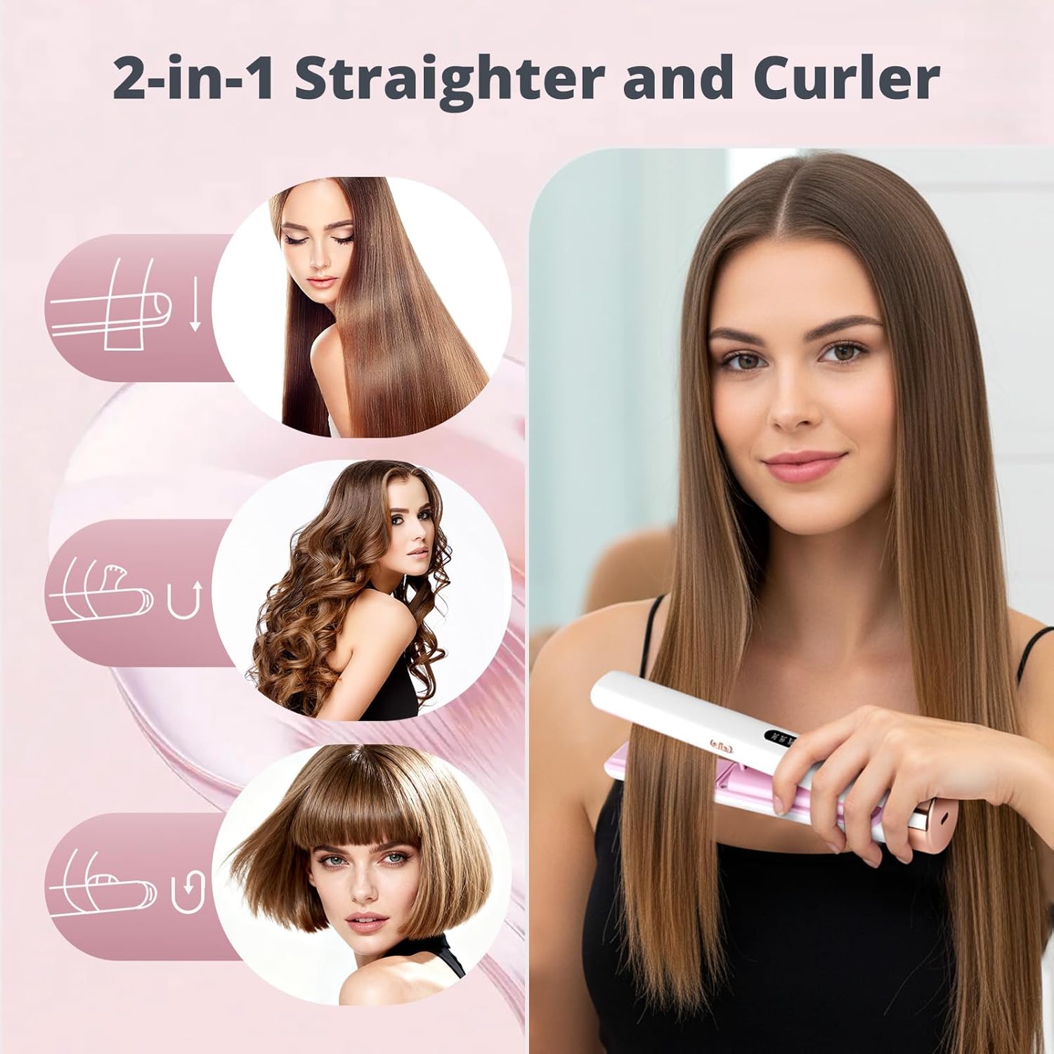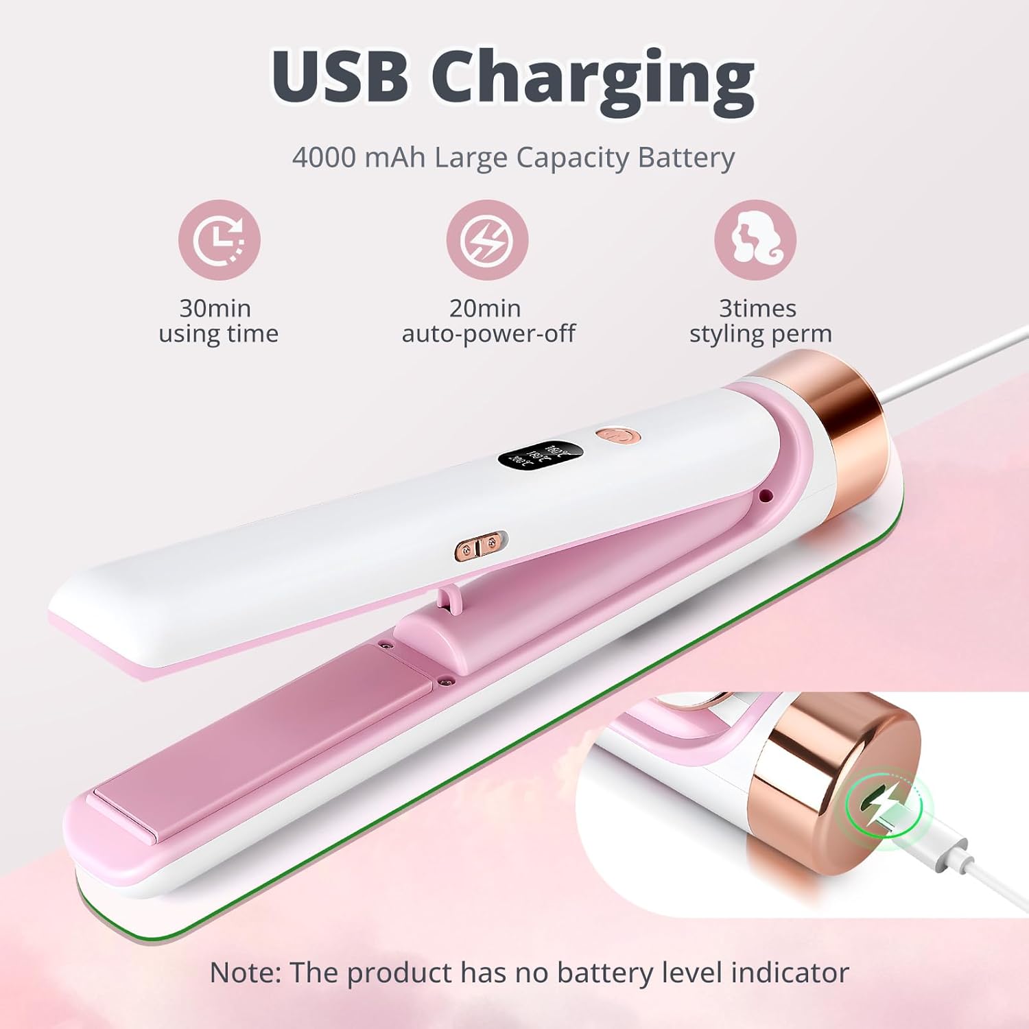 صاف کننده های بی سیم، صاف کننده های مو قابل حمل 2 در 1، صاف کننده و فر کننده قابل شارژ با باتری 4000 میلی آمپر ساعت، مینی صاف کننده ها، آهن صورتی برای خانم ها