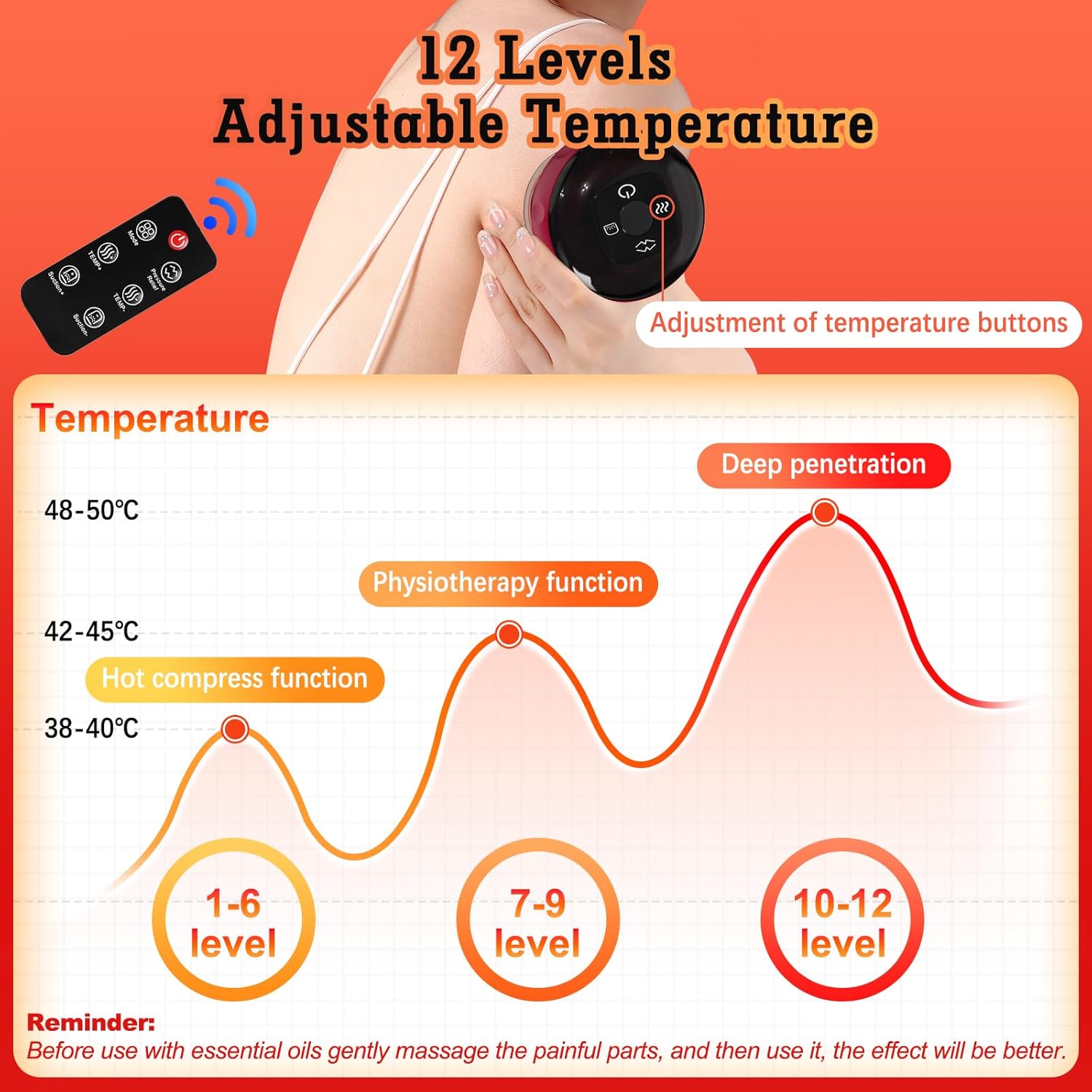 【۱۲ سطح دما و مکش قابل تنظیم】 این مجموعه بادکش درمانی گوا شا دارای ۱۲ سطح مکش قابل تنظیم و ۱۲ تنظیم گرما است. سطوح ۱-۶: ۳۸-۴۰ درجه سانتیگراد برای کاربران تازه کار؛ سطوح ۷-۹: ۴۲-۴۵ درجه سانتیگراد برای آقایان یا برای دردهای عضلانی عمومی؛ سطوح ۱۰-۱۲: ۴۸-۵۰ درجه سانتیگراد برای کاربرانی که دردهای عضلانی شدید دارند. دماهای فوق فقط برای مرجع هستند؛ لطفاً دما را با توجه به شرایط واقعی خود انتخاب کنید. 【چندکاره】 (1) کلید تایمر هوشمند 20 دقیقهای، دستان شما را آزاد میکند. (2) طراحی بدون شعله باز، استفاده ایمن. (3) عملکرد آزادسازی فشار با یک لمس، فوراً فشار منفی را آزاد میکند و به راحتی فنجان بادکش را برمیدارد. (4) بادکش نوری شفاف، فرآیند ماساژ را حس میکند. (5) چراغ قرمز پرانرژی داخلی برای از بین بردن رطوبت بدن و تسکین عضلات.