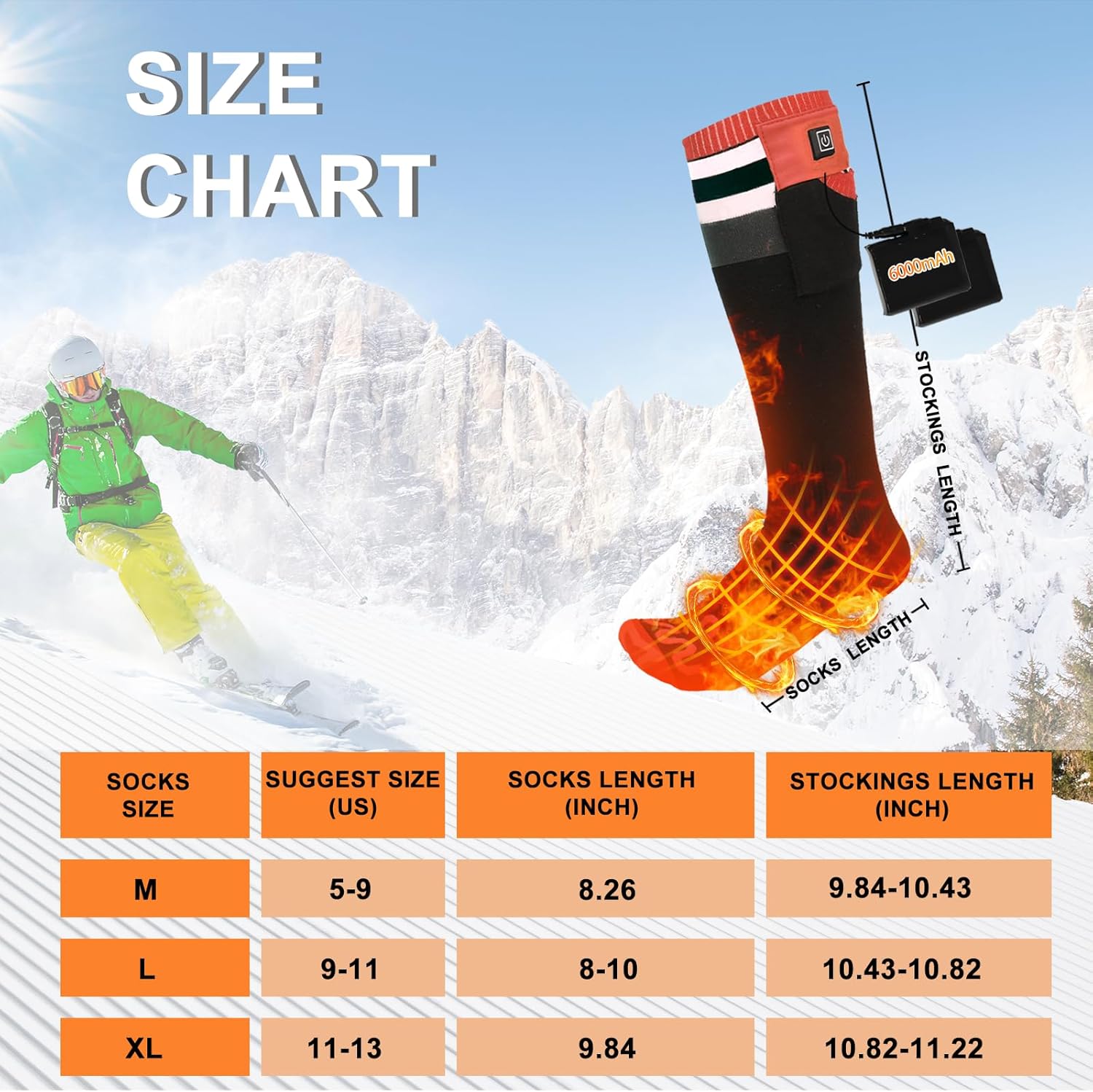 جوراب گرم شونده مردانه زنانه 7.4 ولت 22.2 وات ساعت، 2 عدد باتری 3000 میلی آمپر ساعت قابل شارژ تا 17 ساعت (نارنجی، سایز بزرگ)