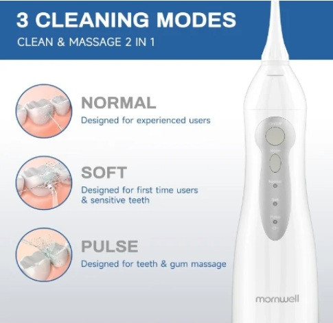 واترجت شارژی Mornwell ضد آب (IPX7) است، بنابراین به سادگی در مواقع استحمام قابل استفاده است. همچنین دارای مخزن آب بسیار بزرگ 300 میلی لیتری با جریان آب در حدود 60 ثانیه است و می توانید بدون نیاز به پر کردن مجدد آب، تمام مراحل تمیز کردن دهان خود را طی کنید. .