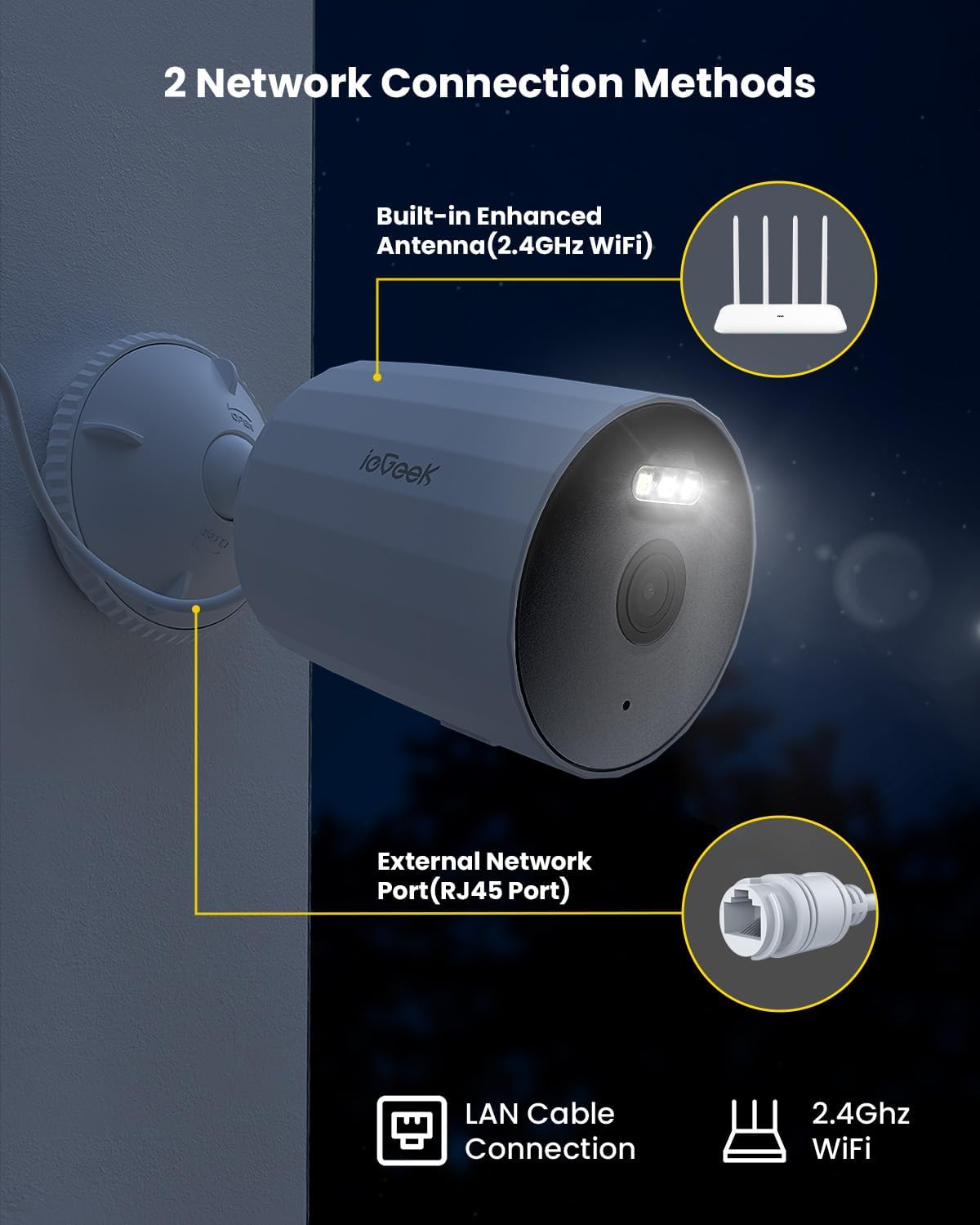 دوربین امنیتی فضای باز ieGeek دارای وضوح تصویر ۴ مگاپیکسل است و کیفیت تصویر بالایی ارائه میدهد. وقتی در حیاط خلوت نصب میشود، میتوانید جزئیات بیشتری از اقلام، مانند اطلاعات پلاک خودرو در گاراژ را ببینید. همچنین به قابلیت بزرگنمایی تصویر ۸ برابر مجهز است که به شما امکان میدهد در صورت نیاز، آنچه را که در کنار جاده است به وضوح ببینید. پلاک خودروها را میتوان به صورت آنی بزرگ کرد. دوربین مداربسته ieGeek دارای وضوح تصویر ۲.۵ اینچ HD است که میتواند تصاویر واضحتری ارائه دهد و به شما این امکان را میدهد که منطقه مورد نظر خود را بهتر مشاهده و نظارت کنید. قابلیت دید در شب تمام رنگی میتواند تصاویر رنگی واقعی را در محیطهای شب ارائه دهد، بنابراین دیگر لازم نیست نگران اثرات نظارتی ناشی از نور ناکافی باشید. در عین حال، این دوربین دارای فاصله دید در شب ۳۳ فوت (حدود ۱۰ متر) است که میتواند اشیاء دور از دوربین را به وضوح ضبط کند. چه روز باشد و چه شب، این دوربین امنیتی میتواند یک تجربه نظارتی با کیفیت بالا را برای تضمین امنیت خانه یا محل کار شما فراهم کند. این دوربین از حسگرهای مادون قرمز برای تشخیص تغییرات حرارتی در محیط اطراف استفاده میکند. هنگامی که شخصی یا حیوانی از آنجا عبور میکند، دوربین بلافاصله این تغییر را ثبت کرده و به تلفن همراه شما هشدار میدهد تا به موقع متوجه شوید که آیا خطری بالقوه در خانه شما وجود دارد یا خیر. قابلیت تماس دو طرفه به شما این امکان را میدهد که فقط با استفاده از برنامه ieGeek CAM از راه دور با اعضای خانواده، بازدیدکنندگان یا حیوانات خانگی ارتباط صوتی دو طرفه برقرار کنید. میتوانید به راحتی و بدون توجه به جایی که هستید با خانواده خود در تماس باشید. [محافظت در برابر آب و هوا و نویز] این دوربین که میتواند از طریق وایفای 2.4 گیگاهرتز به اینترنت متصل شود، با آنتن تقویتشدهی داخلی خود میتواند قدرت دریافت سیگنال وایفای را بهبود بخشد و به شما این امکان را بدهد که حتی اگر از روتر دور هستید، اتصال خوبی داشته باشید. این دوربین همچنین از گزینه اتصال پورت شبکه خارجی (پورت RJ45) پشتیبانی میکند. این قابلیت در موقعیتهایی که نمیتوانید از طریق وایفای متصل شوید، مانند اتاقهای خاص با دیوارهای ضخیم یا مکانهای دور از پوشش وایفای، مفید است. با استفاده از پورت شبکه خارجی برای اتصال، میتوانید همیشه از اتصال پایدار شبکه اطمینان حاصل کنید.