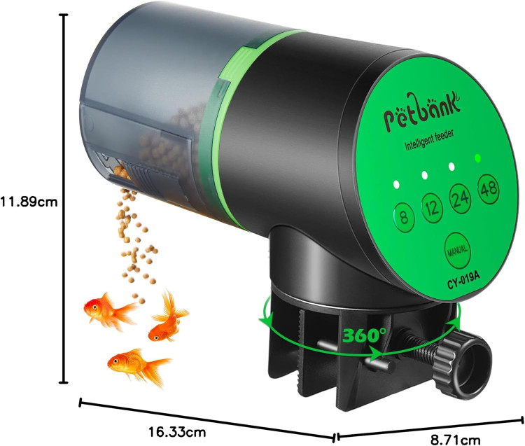 غذادهنده ماهی برای تعطیلات: این غذادهنده برای آکواریوم ۶۰۰ لیتری (۱۵۸ گالن آمریکایی / ۱۳۱ گالن بریتانیایی) مناسب است و میتواند به طور کامل ماهیهای قرمز و لاکپشتها را در آخر هفتهها یا تعطیلات تغذیه کند.