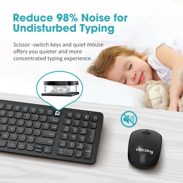 2. کاهش نویز تا 98٪. صفحه کلید بی سیم VicTsing که با ساختار سوئیچ قیچی در زیر هر کلید به کار گرفته شده است، نویز هنگام ضربه زدن را تا حد زیادی کاهش می دهد. علاوه بر این، ماوس در هنگام استفاده بی صدا و بادوام است. تمرکز خود را حفظ کنید بدون اینکه نگران مزاحمت دیگران باشید.