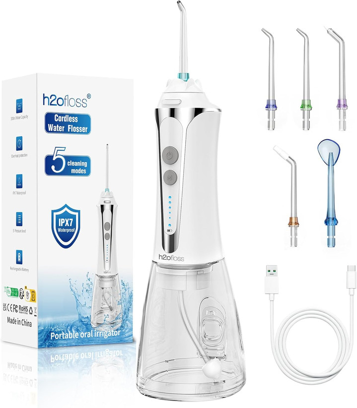 واترجت دندان برند H2ofloss بی سیم مدل HF-6 ، شستشوی دهان ضد آب IPX7 در 5 حالت، ن مخزن آب 300 میلی لیتری (سفید و مشگی) (بار آمازون) برند شناخته شده اورجینال و کیفیت عالی
