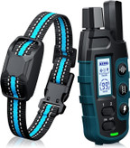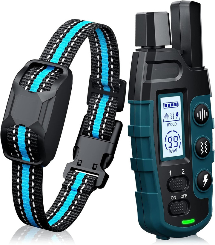 قلاده سگ برند AvviKro - قلاده آموزشی ۱۰۰۶ متر (۳۳۰۰ فوت) با ریموت برای سگهای کوچک، متوسط و بزرگ با وزن ۲.۲ تا ۵۴.۴ کیلوگرم، قلاده الکتریکی قابل شارژ و ضد آب با زنگ (۱-۸)، لرزش (۱-۱۶) (۱ ریموت + ۱ گیرنده (آبی))
