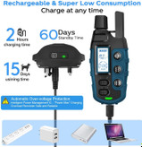 باتری قابل شارژ USB و زمان آماده به کار طولانی: ظرفیت باتری حداکثر گیرنده ۶۵۰ میلیآمپر ساعت و باتری ریموت ۳۰۰ میلیآمپر ساعت است. پس از شارژ کامل در عرض ۲ ساعت با کابل شارژ موجود در بسته، گیرنده تا ۳۰ روز کارایی و ریموت تا ۶۰ روز دوام میآورد. از یک تعطیلات طولانی با حیوان خانگی خود لذت ببرید!