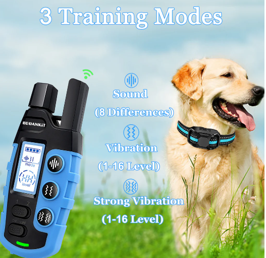 3 Effective Training Modes: Vibration(1-16 levels), Strong vibration(1-16 levels) and Sound(8 different), you can choose the suitable mode to train your dogs.