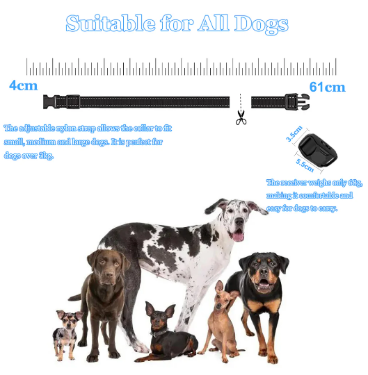 The length of the collar is adjustable from 4 to 61 cm. This dog training collar is suitable for small, medium and large dogs. This dog training collar is safe and effective for dogs over 3kg.
