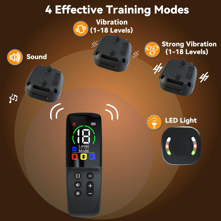 3 Effective Training Modes: Vibration(1-16 levels),Strong vibration(1-16 levels) and Sound, you can choose the suitable mode to train your dogs,and correct the dog's bad behavior more effectively.Digging,Barking,Biting,Recall, Fighting......etc.