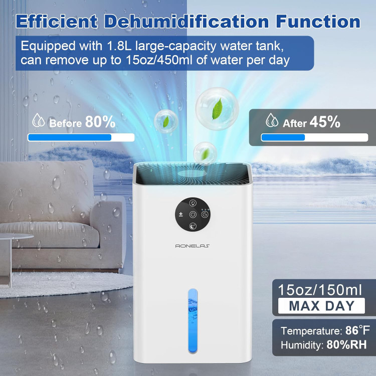 رطوبت گیر و تصفیه هوا AONELAS MODEL:DS01 جنس پلاستیکABS ظرفیت1800ml تایمر6ساعت،8ساعت،10ساعت 22.5ولت وزن1025گرم اندازە162*130*250mm
