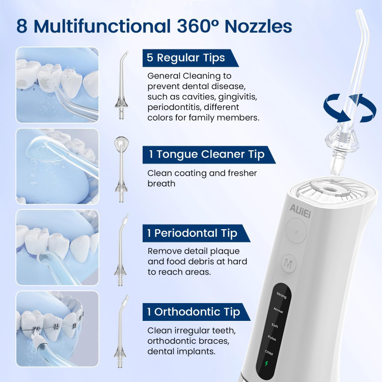 ✅【8 جت تیپ چند منظوره و تمیز کردن تمام جهت 360 درجه】 این پاک کننده دندان آب با 8 نوک جت جایگزین برای گزینه های متعدد تضمین می کند که می توانید فشار را به دهان شخصی خود تنظیم کنید. نازل قابل چرخش 360 درجه و لوله آب نوآورانه با طراحی توپ جاذبه، تمیز کردن آسان را در هر زاویه ای امکان پذیر می کند، به جلوگیری از پوسیدگی دندان، پلاک دندان، جرم دندان، خونریزی لثه و حساسیت بیش از حد دندان کمک می کند و به شما کمک می کند تا تمام نیازهای مختلف تمیز کردن دندان های خانواده خود را برآورده کنید.