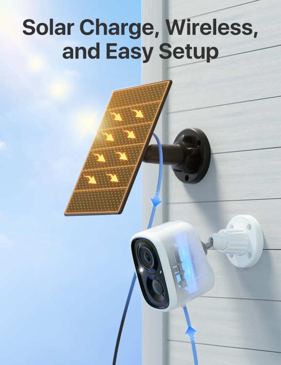 IP65 ضد آب و هوا، راه اندازی ساده: سخت ترین آب و هوا را تحمل می کند. با استفاده از پیچ به راحتی به دیوار متصل می شود. طول کابل پنل خورشیدی 9.2 فوت (2.8 متر) است. براکت های دوربین و پنل خورشیدی برای قرارگیری انعطاف پذیر در هر گوشه بیرونی قابل تنظیم هستند