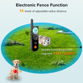 【سیستم حصار سگ بیسیم ایمنی】 سطح لرزش و شوک الکتریکی را از قبل تنظیم کنید، پس از باز کردن حالت حصار، سطح فاصله شعاع مورد نیاز را در 14 سطح فاصله (25-3500FT) تنظیم کنید، زمانی که سگ از فاصله حصار فراتر رفت، کنترل از راه دور زنگ کنترل، گیرنده ابتدا 3 بار بوق می دهد، سپس 5 بار با لرزش بوق می دهد. یقه به طور خودکار شوک را روشن نمی کند. علاوه بر این، می توانید از صدا، لرزش و شوک به صورت دستی در حالت حصار الکترونیکی نیز استفاده کنید.