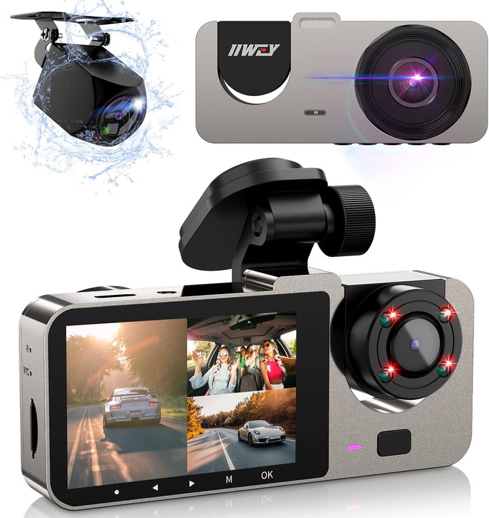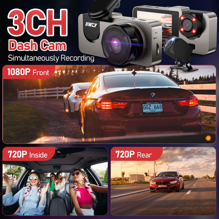IIWEY T2 PRO، دوربین ثبت وقایع جلو و عقب، بغل سه کاناله، دوربین داش کم 1080P برای خودرو با 4 لامپ مادون قرمز، دوربین سه طرفه خودروی فوق العاده دید در شب، LCD 2.5 اینچی، مانیتور پارکینگ 24 ساعته، سنسور G، USB C، ضبط حلقه