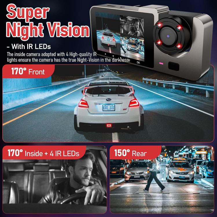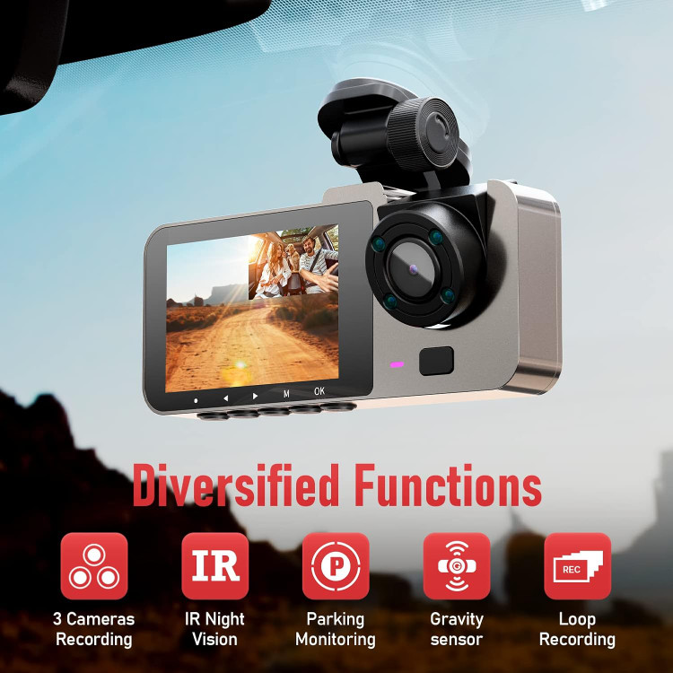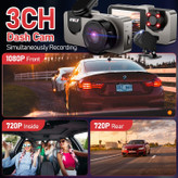 【داش کم دوربین سه گانه برای پوشش جامع】این داشبورد دارای سه دوربین است که به طور همزمان ضبط می کنند، با دید دوربین جلو/داخلی با زاویه باز 170 درجه و دید دوربین عقب 150 درجه برای ثبت هر جزئیات و شواهد مهم.