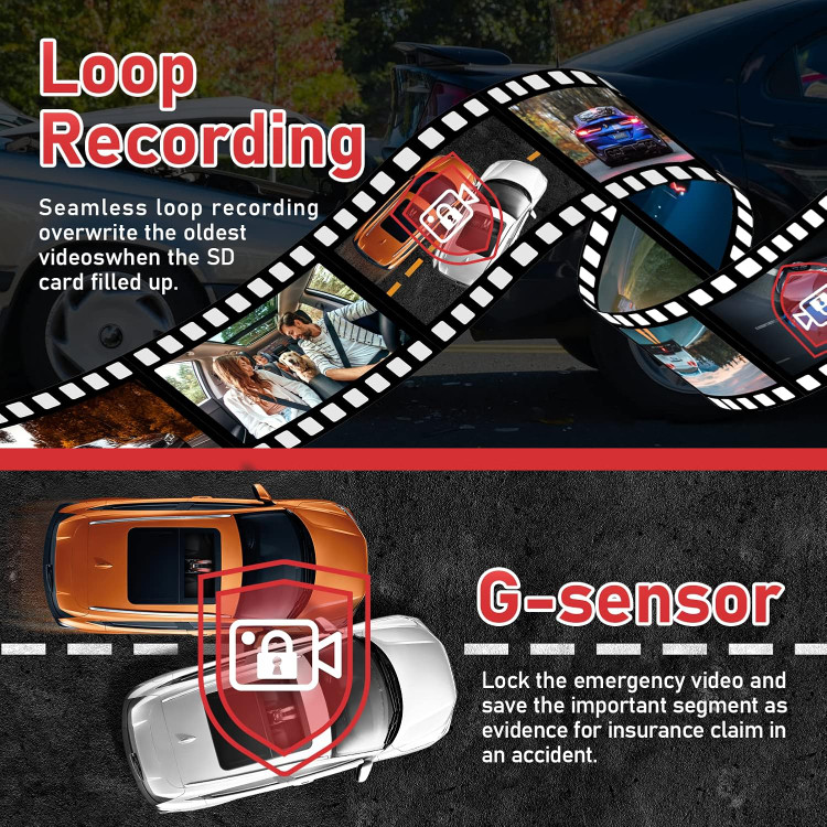 【ضبط حلقه و قفل اضطراری تصادف】 ضبط حلقه قدیمیترین ویدئوها را زمانی که کارت SD پر است بازنویسی میکند و ضبط مداوم را تضمین میکند. سنسور G داخلی فیلمهای اضطراری را در صورت تصادف قفل میکند و از آن در برابر نوشتن مجدد محافظت میکند و به عنوان مدرک ارزشمندی عمل میکند.
