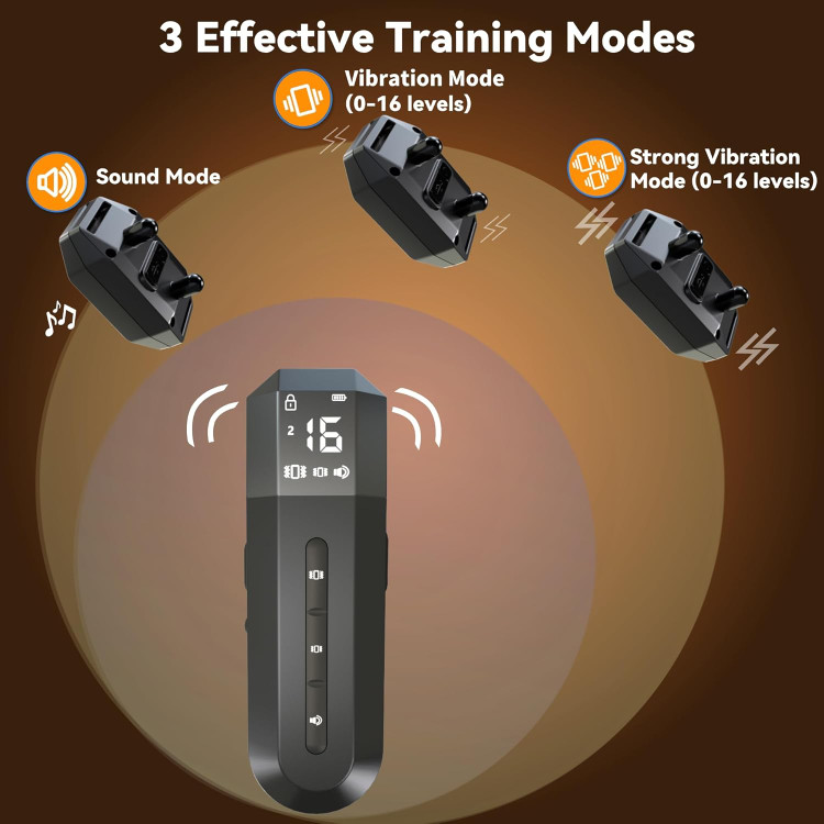 3 Effective Training Modes: Vibration(0-16 levels),Strong vibration(0-16 levels) and Sound, you can choose the suitable mode to train your dogs,and correct the dog's bad behavior more effectively.Digging,Barking,Biting,Recall, Fighting......etc.