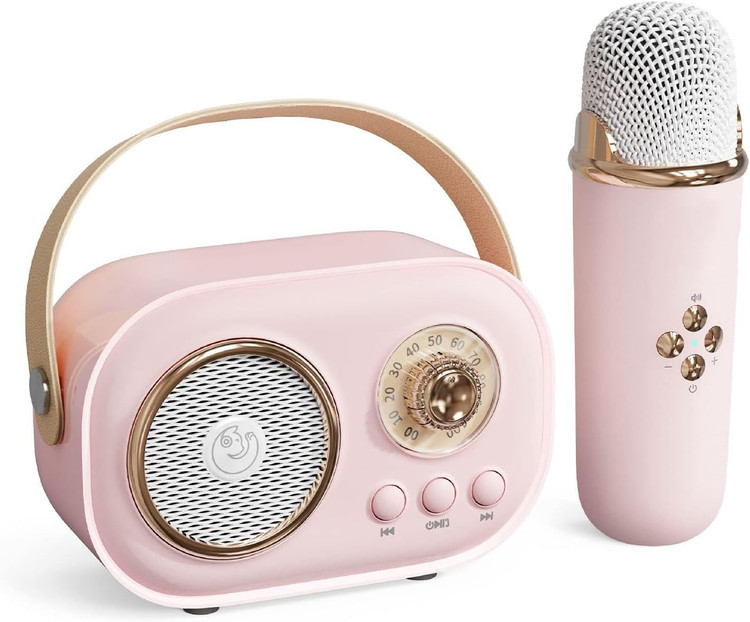 Pick up this cute karaoke machine and wireless microphone,enjoy your moving party! Mini KTV for music playing and singing at any time.No matter your skill level, our portable karaoke machine makes singing fun and easy. With intuitive controls and high-quality sound, you'll be able to belt out your favorite tunes like a pro in no time.For kids, teenagers, friends and adults, retro look with color are surprisingly awesome.